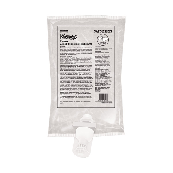 Sanitizante Kleenex® de manos en espuma especialmente indicado para el uso en Salud, Oficinas, Procesamiento de Alimentos, Industria y otras áreas donde sea requerido; presenta buena estabilidad química, no produce irritación y es biodegradable en un 90%. Aplicaciones 2500 usos |