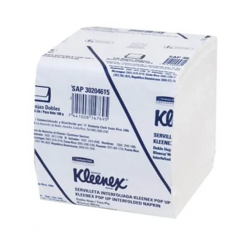 Servilletas Kleenex (paquete 125 hojas dobles) Características: Servilletas Interfoliadas (Pop Up) Tamaño: 20.3cm x 9.5 cm Peso Neto: 100g Contenido: 125 Hojas Dobles Color: Blancas |